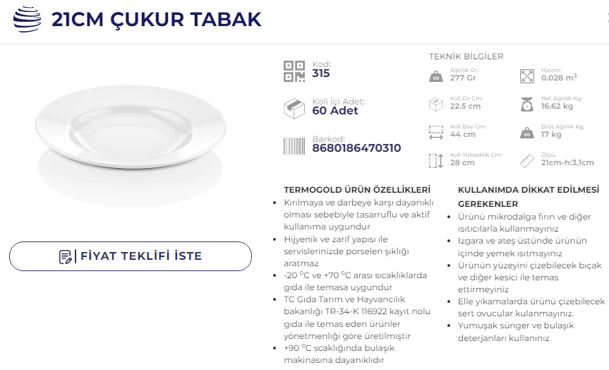 ATLAS ÇUKUR TABAK 21CM TERMO 315 KOD