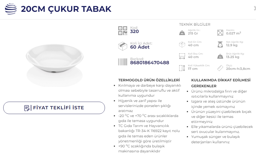 ATLAS ÇUKUR TABAK 20CM TERMO 320 KOD
